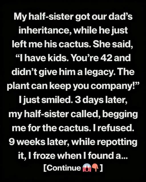 The same cactus that had sat by his living room window for decades—awkwardly shaped, duller than any plant you’d choose on purpose. My half-sister laughed. Not cruelly, just dismissively. She said she had children to think about. Real responsibilities. Real needs. At forty-two, she added, I was surely fine with something small.
