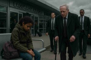 The next morning, Amara sat outside LaGuardia Airport. Her aunt never came. She had no money, no phone, and no one to call. Hours passed as hunger gnawed at her stomach. She hugged her backpack, trying not to cry. That was when a sleek black SUV stopped in front of her. Out stepped two men in suits—and Richard Coleman himself, pale but alive, leaning on a cane.