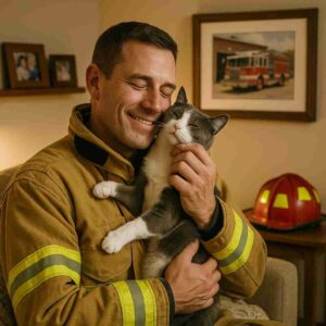 When he finally burst into the open air, his crew thought he had been searching for victims or flare-ups. Instead, he carried a soot-covered, frightened cat clinging tightly to him. No one expected that.