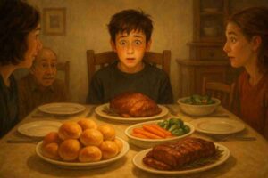 At the dinner table, I noticed everyone quietly staring at me. I didnât understand why. The food looked incredibleâwarm rolls, slices of meat, and a spread of vegetables. I couldnât stop staring at the dishes, almost as if they were from another world. I must have looked out of place, and that left me feeling embarrassed.