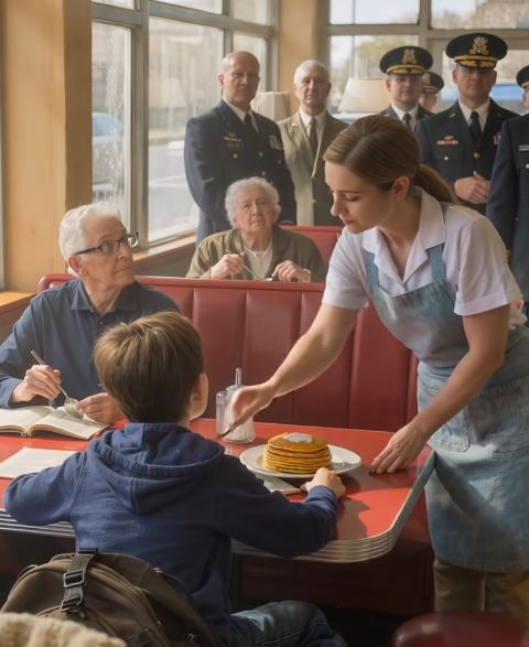 As Jenny absorbed this life-altering news, the boy walked in and went straight to his booth. Overwhelmed, Jenny knelt and opened her arms, and he spoke the same two words he always did, but this time they echoed with a profound new meaning. In that moment, the entire diner understood that Jenny’s simple gifts of pancakes were far more than just food. They were a silent promise kept, a bridge of compassion built between a grieving child and a community, and a powerful reminder that the smallest acts of kindness can honor the greatest of sacrifices.