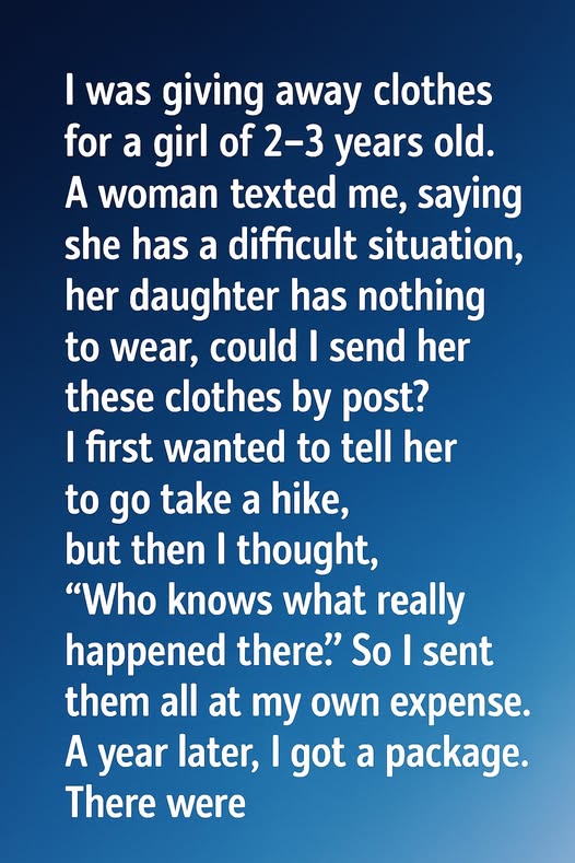 I was just trying to clear out my daughter’s closet. When I posted the items online for free, I expected a quick, simple exchange. One response stood out—a woman from another city explained she was starting over and couldn’t afford clothes for her toddler. Despite a flicker of doubt about internet strangers, her heartfelt message moved me. I packed up the clothes, added a small stuffed animal for good measure, and shipped the box, then promptly forgot about it.